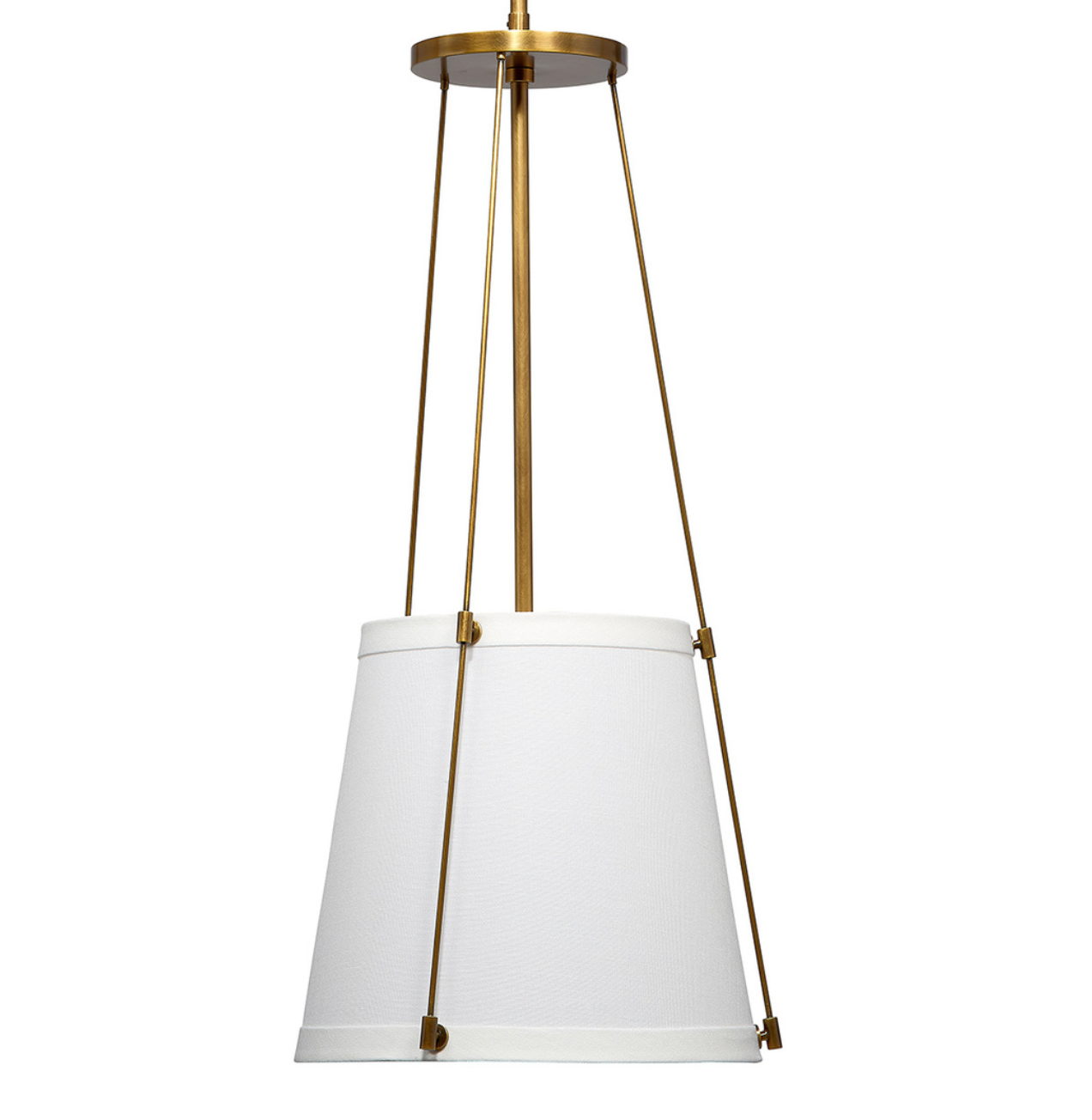 This collection of sconces and pendants features off-white drum shades in pure linen, producing a softly diffuse glow. Each is suspended from a delicate framework of antiqued brass and is as effortlessly appealing as the Southern California lifestyle that inspired it.